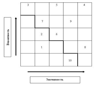 В-девятых, после определения возможных сценариев развития предприятия и их ранжирования составляется матрица рисков – графическое и текстовое описание рисков, свойственных каждому сценарию. По одной стороне такой матрицы указывается значимость риска, а по другой – вероятность его возникновения (рис. 4).