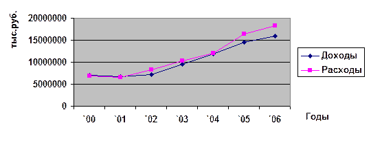 Рис. 2.1. Динамика изменения доходов и расходов бюджета УР в период 2000-2006гг.