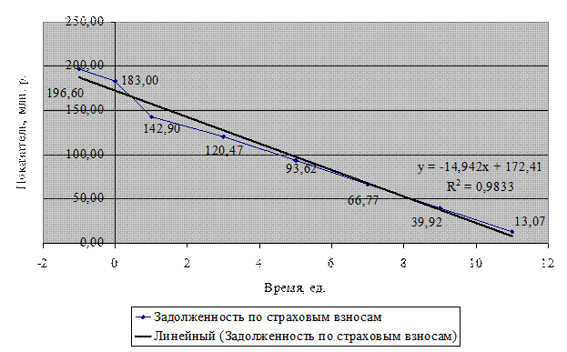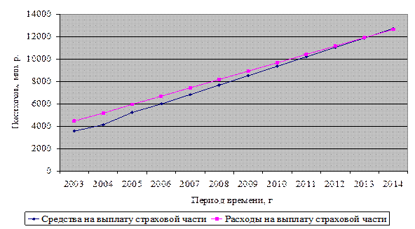 Рис.3.1. График расчетной динамики средств и расходов на выплату страховой части трудовой пенсии за 2003-2014 гг.