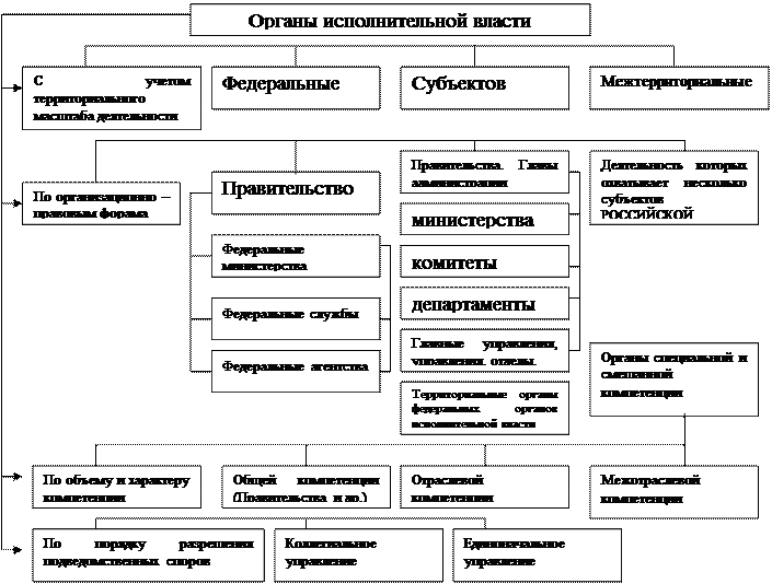 Организационно-правовыми формами органов исполнительной . власти субъектов Федерации могут быть: правительства (советы министров, мэрии, администрации); министерства; комитеты; департаменты; главные управления, управления, отделы и иные органы.