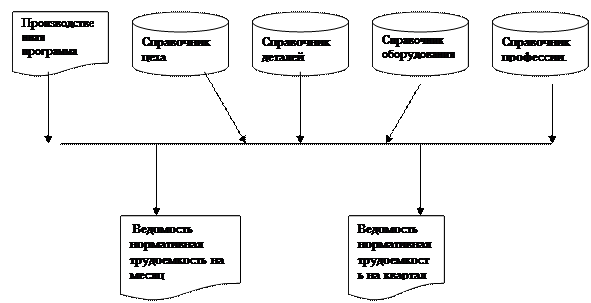 Входная информация: код детали, номер цеха, код оборудования, код профессии, разряд работы, норма штучно- калькуляционная на деталь, план производства деталей на квартал и месяц квартала.