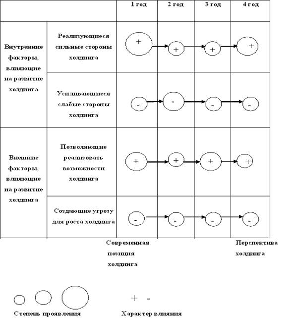 6. Разработана методика, позволяющая выявить положительные и отрицательные факторы, оказывающие наибольшее влияние на формирование и процесс достижения поставленных целей. Предложен механизм ранжирования факторов, основу которого составляет экспертная оценка частоты реализации фактора и степень его важности для холдинга в анализируемый период. Ранжирование факторов является основой для построения матрицы возможных направлений деятельности предприятий. Построенная матрица необходима для определения основных сценариев развития холдинга.