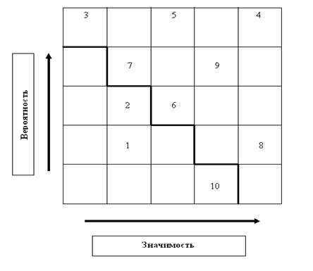 В-девятых, после определения возможных сценариев развития холдинга и их ранжирования составляется матрица рисков – графическое и текстовое описание рисков, свойственных каждому сценарию. По одной стороне такой матрицы указывается значимость риска, а по другой – вероятность его возникновения (рис.4).