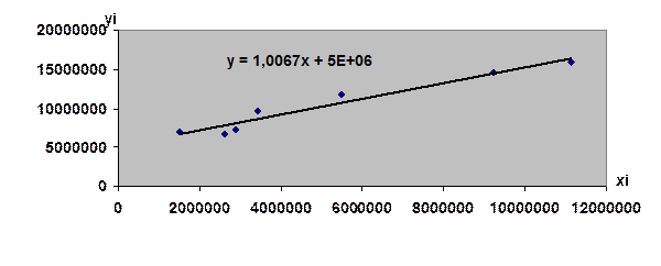 Уравнение имеет вид y = 1,0067*x + 5000000. Исходя из уравнения функция, показывающая процент перевыполнения или недовыполнения бюджета, будет иметь следующий вид: % исполнения = (1,0067*∆x/y0)*100%. Скажем для того, чтобы бюджет исполнился на 101% при запланированной величине доходов 15939725 тыс.р., нужно сверхпоступление данных налогов на 158336 тыс.р. При данном значении запланированных общих доходов не поступление этой суммы по данным налогам приведет к неисполнению бюджета на 1%.