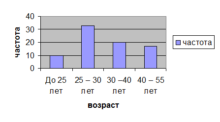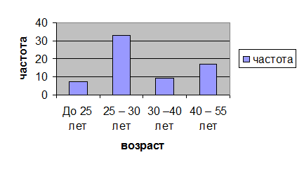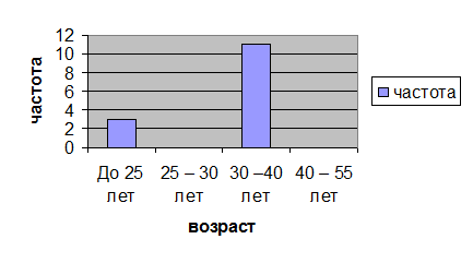 Частота – численность исследуемого персонала (по утвержденному на 1.01.05 г. штатному расписанию), входящая в ту или иную возрастную группу. (общее число персонала – 78 чел. – без учета числа высшего руководства).