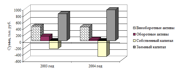 За 2004 год значительные изменения произошли по таким статьям бухгалтерского баланса, как НДС по приобретенным ценностям – задолженность в размере 99 тыс. руб. к концу года погашена полностью; предприятие получило убыток в размере 240,5 тыс. руб., что больше аналогичного показателя прошлого года на 166,7 тыс. руб.; предприятие взяло краткосрочный кредит на сумму 79 тыс. руб., то есть задолженность перед банком увеличилась и составляет на конец 2004 года 774 тыс. руб.; задолженность перед бюджетом по налогам и сборам также возросла на 34 тыс. руб. в результате не уплаты налогов в местные бюджеты.