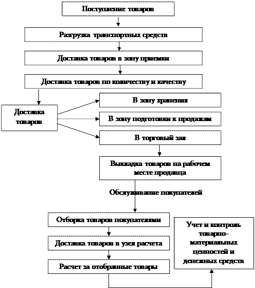 Организация торгово-технологического процесса, последовательность выполнения различных операций зависят от потребительских свойств товаров, степени их готовности к продаже, принятой системы товародвижения, формы продажи, вида и типа торгового предприятия.