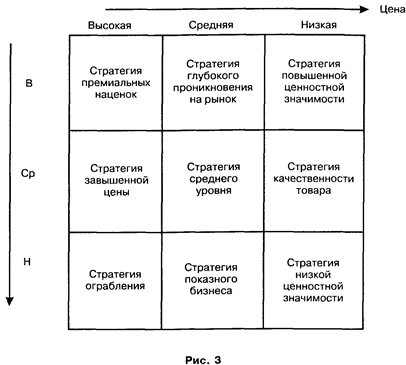 При концентрации усилий организации на избранных сегментах рынка очень важно выработать правильную стратегию в соответствии с показателям «цена—качество» (прежде всего на новую продукцию»), см. рис.3.