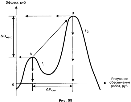 Важно постоянно следить за динамикой ресурсного обеспечения и эффекта (см. рис.55). Такой мониторинг позволит увидеть, как развивается организация, по интенсивному или экстенсивному пути. Например, зная свою оптимизационную кривую за прошлый год (t1), фирма решает увеличить объемы производства (рост потребностей на рынке стимулирует этот процесс). Очевидно, ей требуются дополнительные ресурсы, что может привести к снижению эффекта на прошлогодней оптимизационной кривой. Поэтому фирма планирует предпринять ряд качественно-новых организационных и технологических изменений, позволяющих сместить максимум оптимизационной кривой вправо вверх (t2) от точки А к точке В. Таким образом, приращение ресурсного обеспечения DРопт должно выразиться в приросте эффективности DЭмакс.