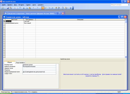 По окончании создания таблицы присвоим ей имя Справочник цехов и зададим ключевое поле. Аналогично создадим все справочные таблицы.