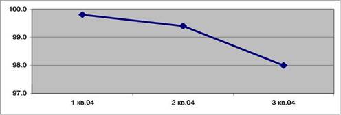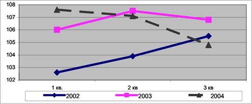 Рост промышленного производства за 9 месяцев 2004 г. к соответствующему периоду прошлого года составил 106,5%. Это - почти такой же темп, какой наблюдался в аналогичном периоде 2003 г., однако он заметно ниже темпов первого квартала и первого полугодия текущего года. Особенностью динамики промышленного производства в 2004 г., в отличие от развития отрасли в 2002-2003 гг. (см. рис. 1), является замедление темпов роста, особенно заметное в 3-ем квартале.