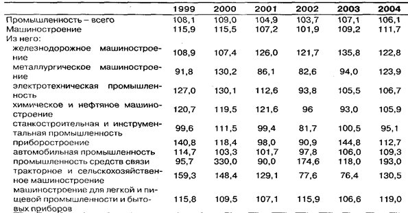 Динамика производства по отраслям машиностроения в 1999-2004 гг. (% к предыдущему году)