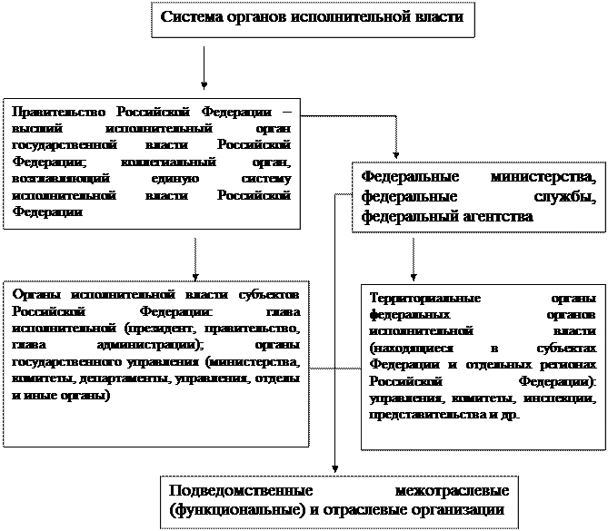 Под системой органов исполнительной власти понимается вертикальная связь между соподчиненными органами на основе разделения компетенции между ними. В систему входят (см. схему 1):