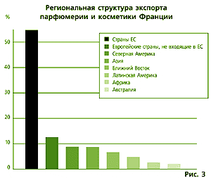 1.2. Национальный экспорт Европейские страны отличаются и по объемам экспорта готовой продукции. Больше всего косметики и парфюмерии в другие страны традиционно поставляет Франция, примерно одинаковые позиции (по 10 – 11%) в мировом экспорте занимают Великобритания, США и Германия (рис. 2). Однако в последнее время США начинают вырываться вперед. Менее значительна доля экспорта Японии и Ирландии, где, однако, имеется собственная вполне конкурентоспособная косметическая промышленность. При этом основной экспорт Франции приходится на страны Европейского Союза. Общая доля европейского экспорта (в страны ЕС и те, что не входят в состав этой организации) составит в экспорте Франции около 65 – 67% (рис. 3). Не менее важными рынками сбыта для Франции остаются страны Северной Америки, Юго-Восточной Азии, Ближнего Востока. Но основные экспортные потоки французской косметики все же ориентированы на географически близкого адресата. 1.3. Иерархия потребительских ценностей По классической маркетинговой схеме люди испытывают неодинаковые потребности в различных парфюмерно-косметических товарах. Вершину предполагаемой пирамиды занимают товары класса «люкс». Прежде всего, это парфюмерия, затем – дорогая декоративная косметика, специализированные банные средства. Они не являются предметами первой необходимости, но давно заняли прочное место в жизни современного человека. Сюда можно отнести и очень дорогие, индивидуально действующие средства ухода за кожей. В самом низу пирамиды расположились товары первой необходимости – зубные пасты и мыло. Эта «социальная косметика» во всем мире пользуется примерно одинаковым спросом. Спрос на средства ухода за кожей и волосами, занимающие промежуточное положение в иерархии потребительских ценностей, отличается в зависимости от страны. Сами понятия «уход за телом», «уход за волосами», завися от национальных привычек и бытовых традиций, и имеют в разных странах разный смысл. Изменения потребления происходят и под влиянием моды – марки предлагают сезонные коллекции и более актуальные цветовые гаммы, вводят в состав продукции новые модные ингредиенты. Подобные товары должны появляться на национальном рынке адаптированными для местных потребительских привычек. Схожая ситуация сложилась и с так называемыми «этническими продуктами» (то есть предназначенными для того или иного цвета кожи или типа волос). Например, средства ухода за жесткими, густыми и кудрявыми волосами африканского типа очень сложны в изготовлении. Если выстраивать иерархию потребительских ценностей в зависимости не от товарных групп, а от потребностей, которые удовлетворяют эти товары, в ней также будет три уровня:
