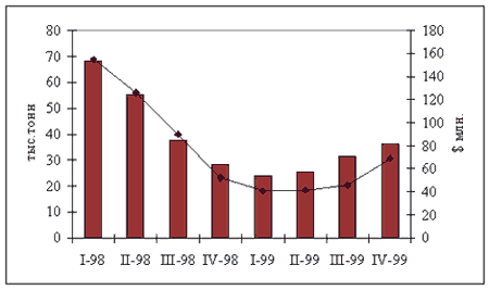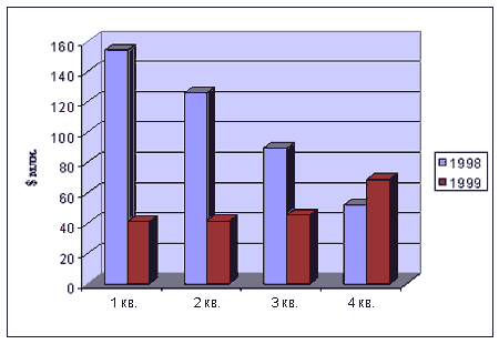 В 90-ые годы уходящего века российский рынок парфюмерии и косметики развивался ускоренными темпами в основном за счет импортной продукции. Пик ввоза парфюмерии, косметики и туалетных средств (ПКП) в Россию, по данным таможенной статистики внешней торговли РФ, пришелся на 1997 г. ($636,2 млн. или 1,3% от общего объеме импорта). В этот предкризисный год на российском рынке был представлен наибольший ассортимент зарубежных парфюмерно-косметических товаров, произведенных в 86 странах мира. Финансово-экономический кризис, разразившийся в августе 1998 г., привел к существенному уменьшению ввоза всех зарубежных товаров. В 1998 г., по данным ГТК (без учета поставок из Республики Беларусь), импорт России по сравнению с 1997 г. снизился на 17,9 %, а объем ввоза только парфюмерных, косметических и туалетных средств уменьшился в 1,4 раза. В 1999 г. по сравнению с 1998 г. объем импорта рассматриваемой зарубежной продукции сократился более, чем в два раза. Квартальные объемы поставок ПКП в стоимостном выражении приведены на гистограмме №1. Сравнение объемов импорта в первом и последнем кварталах 1998 г. показали сокращение ввоза парфюмерно-косметической продукции в 3 раза (с $154,53 млн. до $52,13 млн.), а в 1999 г. — наоборот, увеличение в 1,7 раза. Минимальные объемы импорта ПКП соответствовали 1 кв. 1999 г. (24,0 тыс. тонн на сумму $40,7 млн.), в 4 кв. прошлого года в Россию было ввезено ПКП на сумму $68,82 млн., что в 1,3 раза больше, чем за тот же период 1998 г.
