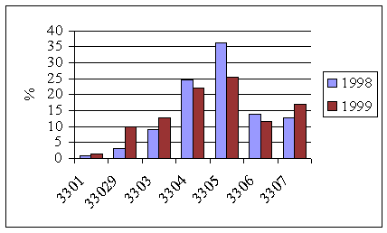 В течение двух лет Россия ввозила относительно большой ассортимент парфюмерно-косметических товаров и туалетных средств (по классификатору ТНВЭД — 33 товарная группа). В 1999 г. было импортировано 117,0 тыс. тонн ПКП более 2000 наименований на сумму $196,4 млн. (без учета смеси душистых веществ, используемых в пищевой промышленности — код подгруппы 33021). Долевое распределение импорта ПКП по товарным позициям в стоимостном выражении представлено на гистограмме №3 (и в таблице). Большую часть импорта, в денежном выражении, как в 1998 г., так и в 1999 г. составляли шампуни, гели, бальзамы, мусс и прочие средства по уходу за волосами (3305), а также косметические средства для макияжа и ухода за кожей, препараты для маникюра и педикюра (3304). Поставки в Россию средств для волос претерпели наибольшего сокращения (в долях на 11%). В 1999 г. по сравнению с 1998 г., объем импорта средств по уходу за волосами в стоимостном выражении сократился в 3,1 раз, а в натуральном — в 2,4 раза. То есть, количество дешевой продукции в этой группе товаров выросла, хотя в большей степени увеличение объема недорогой продукции относится к средствам для гигиены полости рта и зубов (код подгруппы — 3306). В 1999 г. по сравнению с предшествующим годом, объем импорта зубной пасты в стоимостном выражении сократился более, чем в 2,6 раза, а в натуральном — уменьшился всего на 20%.