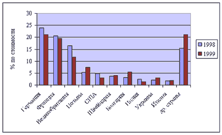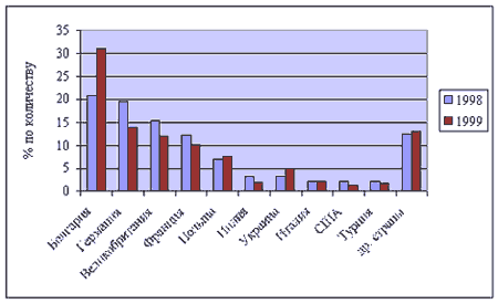 Если рассматривать весь ассортимент зарубежной парфюмерно-косметической продукции и туалетных средств, то в течение 1998 г. Россия ввозила данные товары, произведенные в 81 стране, а в 1999 г. — в 72 странах мира. Почти 95% от всего объема импорта ПКП в РФ приходится на страны дальнего зарубежья, среди которых лидировали Германия, Франция, Великобритания, Польша и Болгария. Долевое распределение импорта по странам происхождения (в % по стоимости и количеству) приведено на двух гистограммах (№4 и №5). В прошлом году по сравнению с 1998 г. при абсолютном снижении объемов ввоза ПКП увеличилась доля более дешевых товаров из Болгарии (на 10%), Украины (2%) и Польши (1%) и сократилась доля дорогостоящей продукции из Германии (на 6%), Великобритании (2%), Франции (2%) и США (1%).