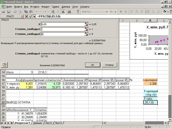 Таким образом, все вариации в объеме выпуска продукции Y на 99,4% обусловлены вариацией в объеме капиталовложений X, т.е. изменениями в факторе X, учтенном в модели.