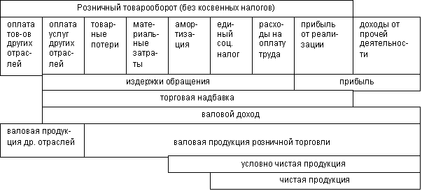 Обобщающим показателем деятельности предприятий и отраслей принято считать валовую продукцию, которая отражает меру их вклада в удовлетворение общественных потребностей. В отличие от промышленности, где обычно применяется термин «валовая продукция», отрасли торговли не производят товары и создаваемая в них стоимость называется валовым доходом (далее по тексту ВД). Эта стоимость создается трудом работников торговли.