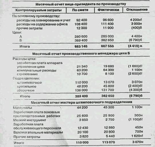 Результат процедуры управленческого учета, в ходе которой фактические результаты сравнивают с запланированными величинами, называется отчетом об исполнении сметы. Взаимосвязанная отчетность различных уровней управления, рассматриваемых в качестве центров затрат, показана в таблице на с. 438. Отчет каждого уровня управления включает графы с указанием: статей контролируемых затрат, затрат по смете, фактических затрат, отклонений от сметы. Последнее может быть либо положительным (без скобок) и означать перерасход, либо отрицательным (в скобках) и означать экономию затрат. Сметные данные пересчитываются по формуле гибкой сметы так, что они отражают реальный (фактический) уровень выпуска продукции.