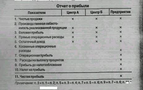 В простейшем случае стандартный отчет о прибыли заканчивается для центров прибыли на показателе валовой прибыли, которая и является критерием оценки деятельности центра. Остальные показатели отчета о прибыли определяются и рассчитываются только на уровне предприятия в целом (см. таблицу ниже).