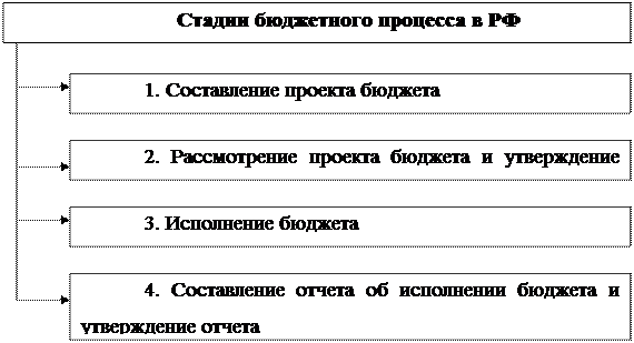 Бюджетный процесс в Российской Федерации состоит из следующих стадий бюджетной деятельности: составление проекта бюджета; рассмотрение проекта бюджета и утверждение бюджета; исполнение бюджета; составление и утверждение отчета об исполнении бюджета. Стадии бюджетного процесса РФ показаны на рис. 1.1. (приложение 1)