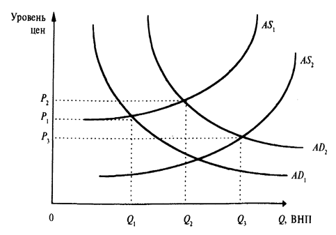 Первоначально равновесие в рамках национальной экономики (совокупный спрос AD1, совокупное предложение AS1) достигалось при объеме производства Q1 и уровне цен Р1. Сокращение налоговых ставок с доходов населения привело к росту совокупного предложения с AD1 до AD2. При том же самом совокупном предложении это привело к росту равновесного объема ВНП и увеличению уровня цен (соответственно - Q2 и P2). Увеличение совокупного спроса при одновременном снижении налоговых ставок с доходов предпринимателей привело к росту и совокупного предложения с AS1 до AS2. Достигнуто новое равновесие в рамках национальной экономики (совокупный спрос AD2, совокупное предложение AS2) при объеме производства Q3 и уровне цен Р3.