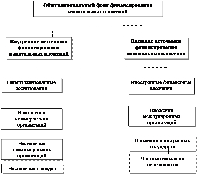 Финансирование капитальных вложений на макроуровне. Совокупность источников финансирования капитальных вложений на макроуровне образует общенациональный фонд. В него включаются внутренние и внешние источники (рис. 1.1).