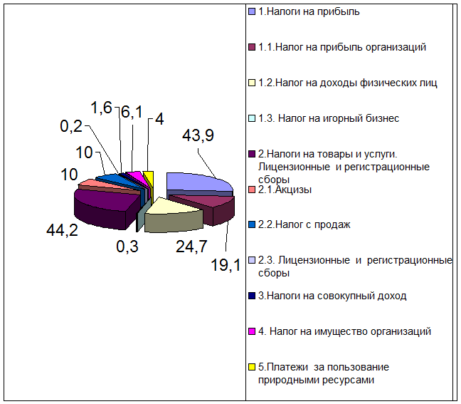 Представив структуру налоговых доходов за 2003 г. и за 2005 г. можно сделать следующие выводы, что доля налогов в общем объеме не изменилась. В 2003 г. наибольший удельный вес занимает налог на прибыль организаций – 46,9% и платежи за пользование природными ресурсами 21,7%, а в 2005 г. налог на прибыль организаций уменьшился и составляет 43,9%, платежи за пользование природными ресурсами также уменьшились и составляют 4%.Налог на доходы с физических лиц увеличился с 17,1 % до 24,7%. Налоги на товары и услуги, лицензионные и регистрационные сборы также претерпели значительные изменения: в 2003 г. они составляли лишь 6,9 % в структуре налоговых доходов бюджета УР, а в 2005г 44,2 %.