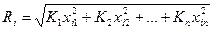 Все элементы матрицы координат возведем в квадрат. Из суммы квадратов показателей, выбранных для комплексной оценки, извлекается квадратный корень для получения показателя обобщающей рейтинговой оценки Ri.