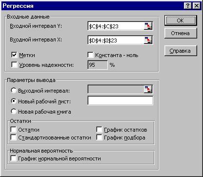 2. С помощью надстройки «Анализ данных… Регрессия» программного средства строим линейное уравнение множественной регрессии с полным перечнем факторов (меню «Сервис» ® «Анализ данных…» ® «Регрессия»). Панель регрессионного анализа изображена на рис. 2.