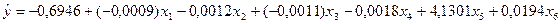 4. По результатам проверки статистической значимости коэффициентов уравнения регрессии Y=f(X1, X2, X3, X4, X6), проведенной в предыдущем пункте, строим новую регрессионную модель, содержащую только информативные факторы. Такими факторами будем считать либо факторы, коэффициенты при которых статистически значимы, либо факторы, у коэффициентов которых t‑статистика превышает по абсолютной величине единицу (другими словами, абсолютная величина коэффициента больше его стандартной ошибки). К первой группе относятся факторы Х1, Х2, Х6, ко второй — фактор X4. Фактор X3 исключается из рассмотрения как неинформативный (÷tb4ç<1), и окончательно регрессионная модель будет содержать факторы X1, X2, X4, X6.