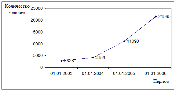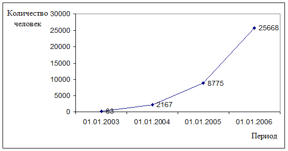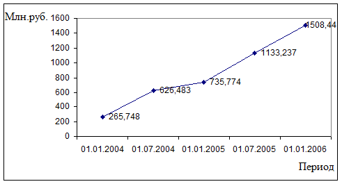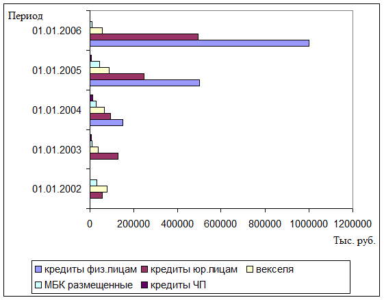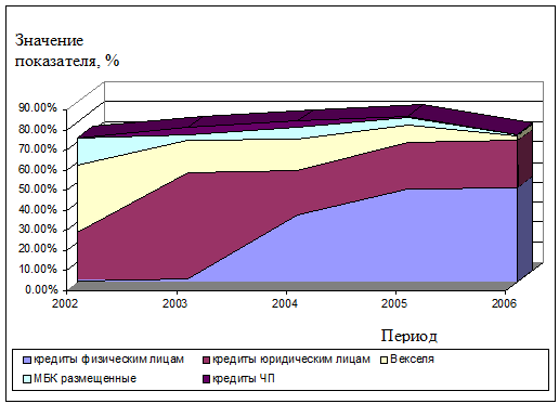 Проанализировав данные (см. рис. 1.1) становится очевидным, что ключевым видом услуг оказываемых банком в области размещения денежных средств является кредитование физических лиц, доля данных кредитов в общей величине кредитного портфеля банка по состоянию на 01.01.2006 года составляет: 47,22%.