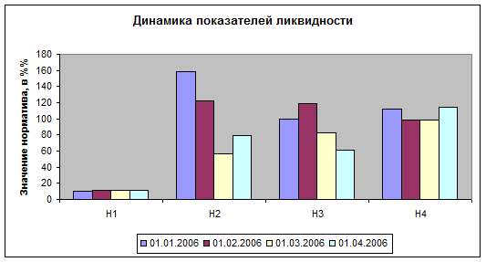 Как видно из приведенной таблицы, ОАО «ИжЛадабанк» выполняет все нормативы Центрального Банка РФ, что свидетельствует о надежности функционирования банка. Увеличение норматива Н1 на 01.04.2006 произошло из-за увеличения собственные средства (капитал) банка, определенные в соответствии с Положением Банка России от 10 февраля 2003 года N 215-П. Увеличение норматива Н2 на 01.04.2006 произошло из-за увеличения высоколиквидных активов и уменьшения обязательства до востребования. Уменьшение норматива Н3 на 01.04.2006 произошло из-за увеличения обязательства (пассивы) до востребования и уменьшения ликвидных активов. Увеличение норматива Н4 на 01.04.2006 произошло из-за увеличения собственные средства (капитал) банка, определенные в соответствии с Положением Банка России от 10 февраля 2003 года N 215-П.