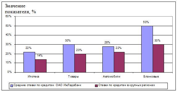 Проанализировав сведения (см. рис. 1.7) можно заключить, что основой кредитных вложений, а значит и основным источником доходов кредитной организации являются вложения в кредиты выданные физическим лицам, доля подобных кредитов составляет на 01.01.2006г. 42.77%, что говорит о слабой диверсифицированности структуры кредитного портфеля и свидетельствует о наличии угрозы потери основного источника доходов вследствие падения ставок на рынке потребительских кредитов, которая принимая во внимание данные рис.1.8, о сравнительной характеристике ставок на потребительские кредиты в Удмуртии и других регионов с более развитыми программами потребительского кредитования выглядит вполне реальной.