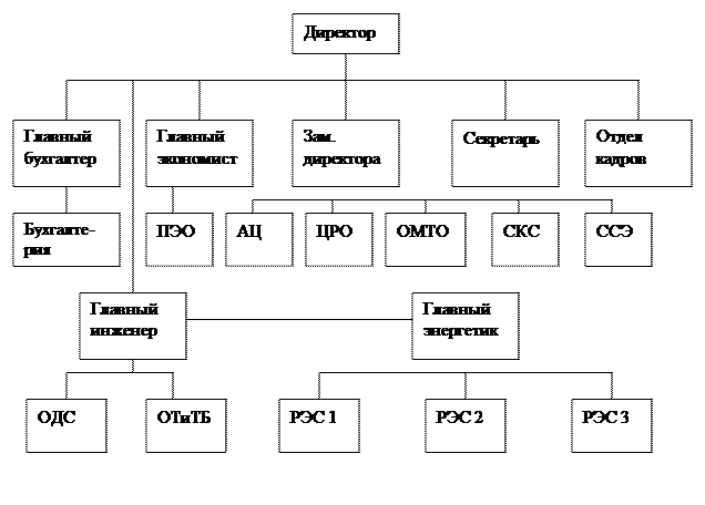 ПЭО – планово-экономический отдел, АЦ – автотранспортный цех, ЦРО – цех ремонта оборудования, ОМТО – отдел материально – технического обслуживания, СКС – служба кабельных сетей, ССЭ – служба сбыта электроэнергии, ОДС – отдел диспетчерской службы, ОТиТБ – отдел труда и техники безопасности, РЭС1, РЭС 2, РЭС 3 – районные электрические сети.