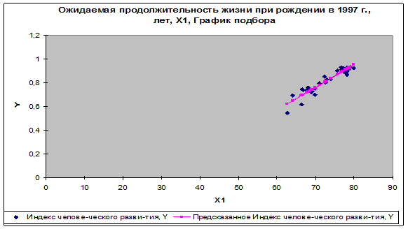 Результат регрессионного анализа для модели у-х1 содержится в табл. 2-4 и на рис. 1. По результатам табл. 4 запишем полученное уравнение линейной регрессии:
