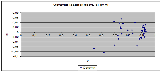 Предпосылка о равенстве математического ожидания остаточной компоненты нулю выполняется, так как на графиках остатков (еi от хi) (рис 4,5) остатки распределены у оси охi симметрично.