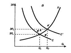 3) равновесная, при которой спрос на труд соответствует его предложению.
