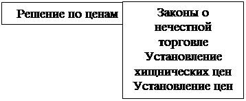 Фиксированные цены. Правительство ограничивает возможности фиксации цен по горизонтали и вертикали. Горизонтальное фиксирование цен порождается соглашениями между производителями, между оптовой и розничной торговлей по установлению цен на данном уровне канала сбыта. Такие соглашения незаконны согласно антитрестовскому законодательству. Чтобы избежать обвинения в фиксировании цен, компания должна тщательно обходить: согласования скидок, условий кредита или условий реализации со своими конкурентами; осуждения цен, надбавок и издержек на профессиональных отраслевых встречах; договоренностей с конкурентами о публикации прейскурантов в один и тот же срок, о ротации низких предложений по контрактам, о едином ограничении производства для поддержания высоких цен; обмена информацией с конкурентами даже на неформальной основе.