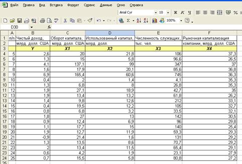 На основе корреляционного анализа выбираем линейную двухфакторную модель регрессии и для дальнейших расчётов составляем новую таблицу исходных данных (рис.1.5):