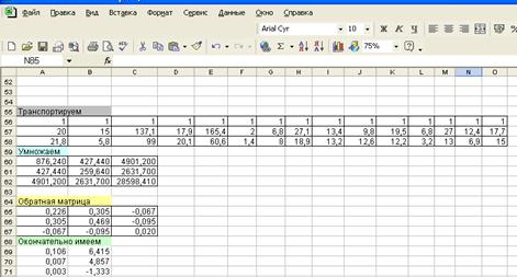 Первоначально транспонируем матрицу X (в Excel=>ТРАНСП), затем её умножаем на исходную матрицу X (в Excel=>МУМНОЖ) и вычислим обратную матрицу (в Excel=>МОБР). После этого обратную матрицу умножим на транспонируемую и на У (в Excel=>МУМНОЖ), (рис.1.6.):