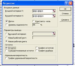 ü В диалоговом окне Регрессия в поле Входной интервал У введём адрес одного диапазона ячеек, который представляет зависимую переменную. В поле Входной интервал Х введём адреса одного или нескольких диапазонов, которые содержат значения независимых переменных;