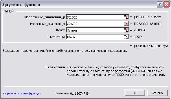 Рис. 4. Расчет коэффициентов регрессии