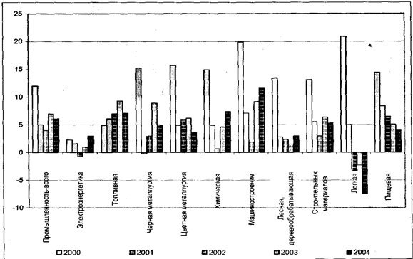 Рис. 2. Изменение динамики производства по отраслям промышленности в 2000-2004 гг. (% к соответствующему периоду предыдущего года)
