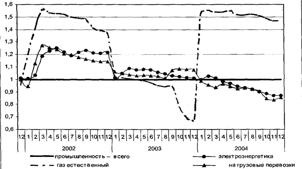 Рис. 3. Динамика цен естественных монополий в 2002-2004 гг. относительно цен производителей промышленной продукции (% к декабрю предыдущего года) (промышленность = 1)