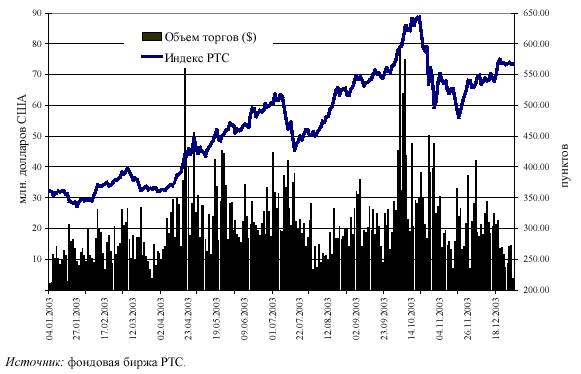 Далее последовал устойчивый рост котировок на рынке – к 6 марта индекс РТС вырос на 61,39 пункта, таким образом, с 27 января увеличившись на 18,27%. Далее на протяжении всего месяца на рынке наблюдалась некоторая коррекция, которая затем сменилась периодом устойчивого роста. Так, с 1 апреля российский фондовый индикатор достиг очередного посткризисного максимума в 518,07 пункта, таким образом, увеличившись по отношению к значению 6 марта на 120,6 пункта (30,34%). При этом объем торгов в течение этих четырех месяцев заметно варьировался – если в марте суммарный оборот составил около 300 млн долл., то в апреле он практически удвоился (около 601 млн долл.), а в мае и июне стабилизировался в районе 450 млн долл. Необходимо отметить, что в апреле показатель дневного оборота торгов достиг своего годового максимума 82,45 млн долл. Далее на рынке последовал спад – на момент закрытия торгов в РТС 17 июля индекс составил 427,64 пункта, снизившись за две недели на 90,4 пункта (-17,46%). Основным движущим фактором такого снижения стала ситуация вокруг НК «ЮКОС» – арест П.Лебедева, являющегося одним из крупных акционеров компании, оказал на инвесторов крайне неблагоприятное влияние.