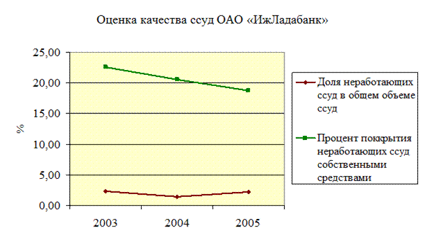 Хотя этот коэффициент в основном касается прошлого периода, он может служить важным инструментом оценки текущего состояния банка (и, в более широком плане – банковского сектора). На данный момент коэффициент качества кредитов, характеризующий банковскую систему Российской Федерации в целом, составляет 3,2%. Значение данного коэффициента ОАО «ИжЛадабанк» на 01.01.2006 г. 2,19%. Оптимальное значение данного коэффициента не должно превышать 5% [].