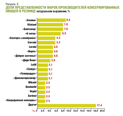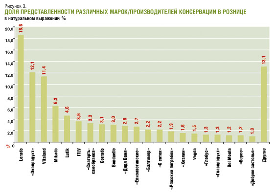 Стоит отметить, что в ряду марок консервированных овощей, занимающих значительную долю рынка, только две выпускаются местными производителями - это «Хозяин» («Донской консервный завод») и «Доброе застолье» (ОАО «Тацинский консервный завод»). Такая ситуация указывает на то, что в России развитие данного рынка тормозится не отсутствием производственных мощностей или сырья, а низким уровнем маркетинговой активности местных производителей, что и не позволяет им выпускать продукцию под собственными брэндами.