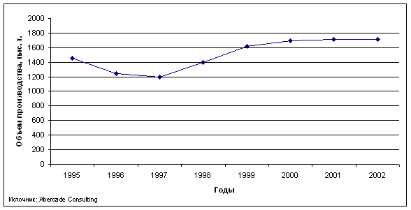Рис. 2. Динамика производства газетной бумаги на территории РФ за период с 1995 по 2002 годы.